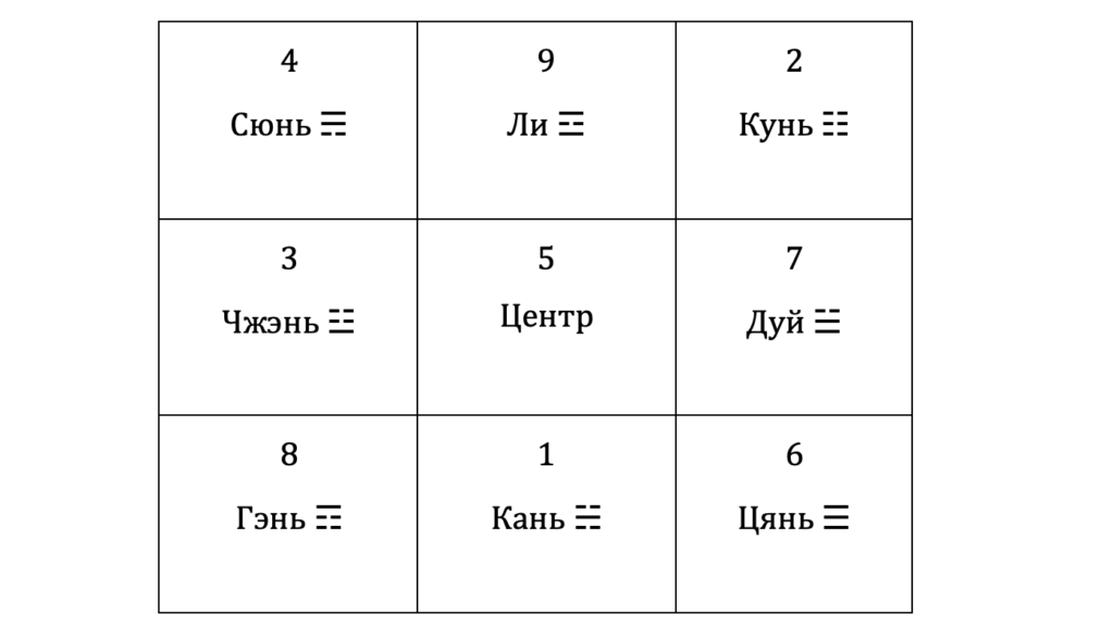 Каждый дворец можно идентифицировать по названию триграммы, номеру или направлению. Например: