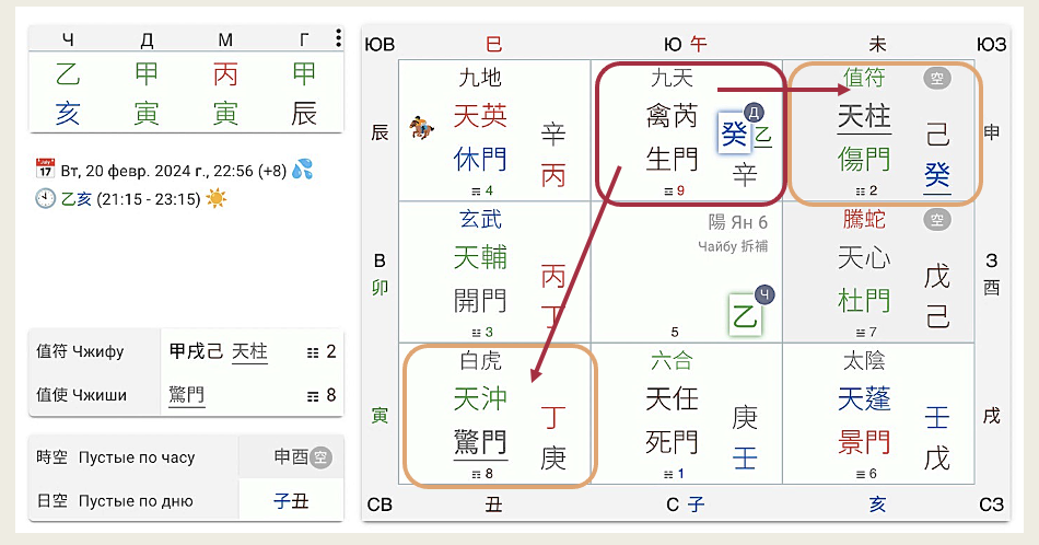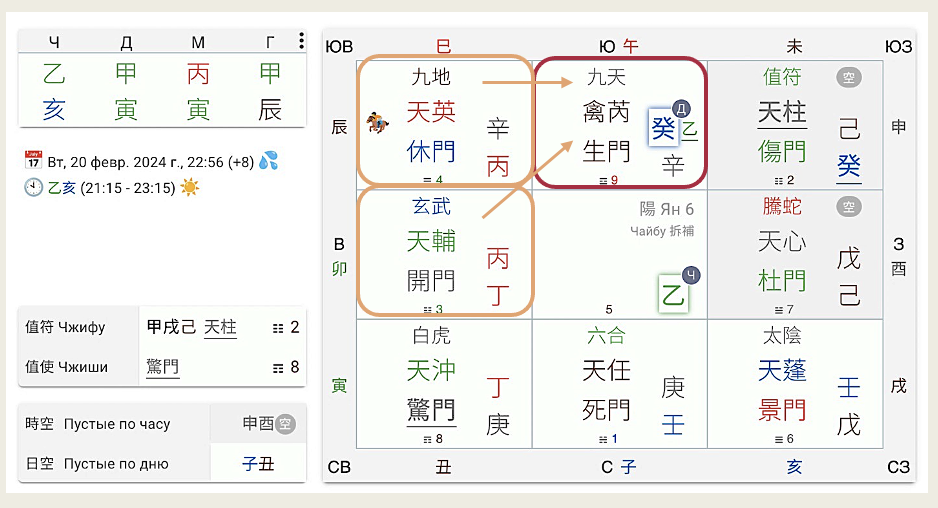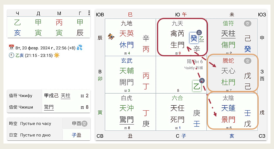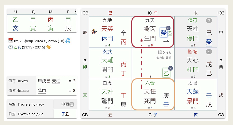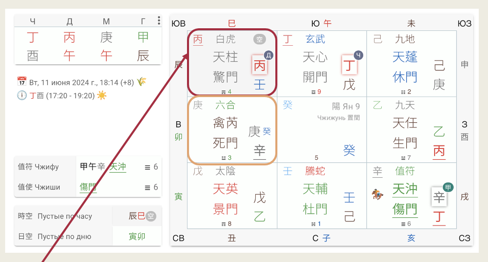 - Определите Небесный ствол дня рождения в ба-цзы даты рождения и найдите его на небесном кольце в карте цимэнь, выстроенной по времени рождения.