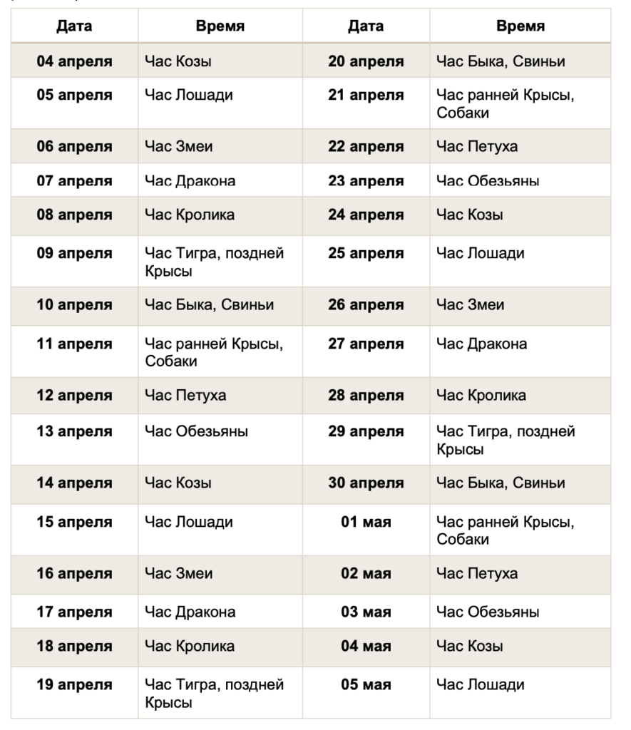 | 12 и 24 апреля | Столкновение день-год | Не подходит для начала важных дел. |