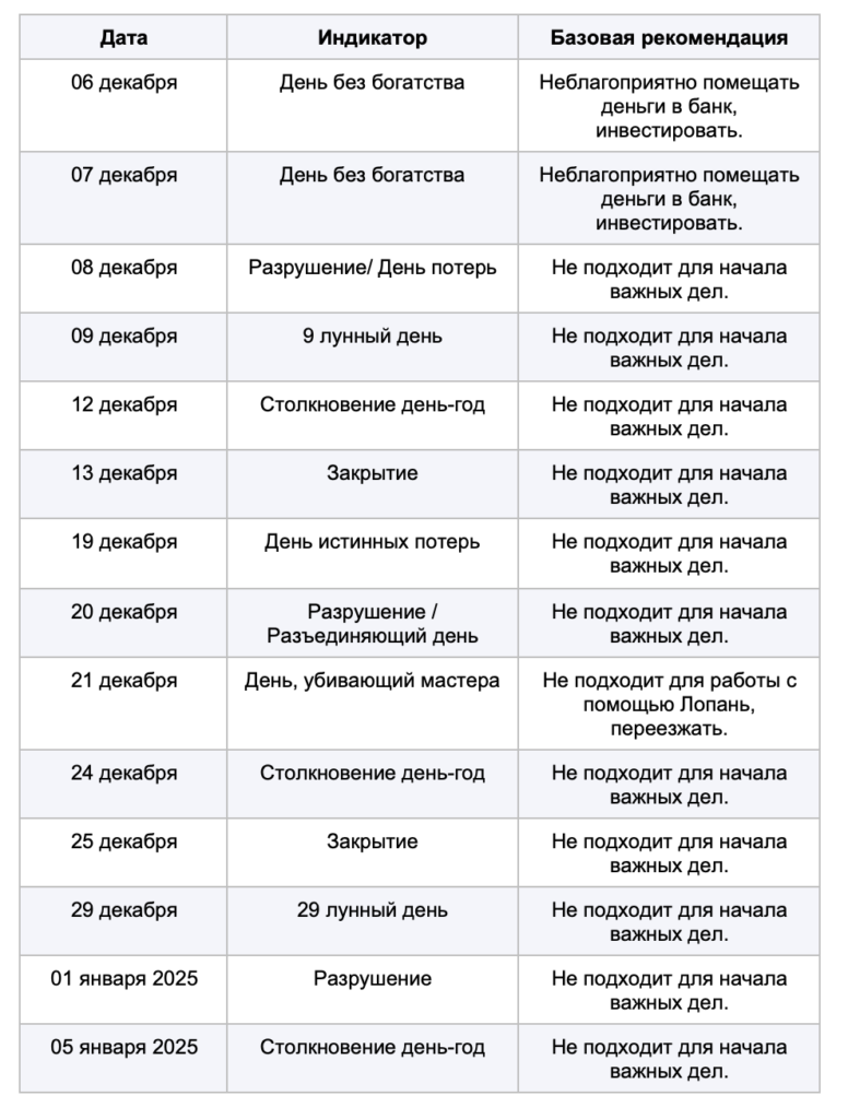 | Дерево Ян 甲, Земля Ян 戊, Металл Ян 庚 | 09, 15, 21, 27 декабря, 02.01.2025. |