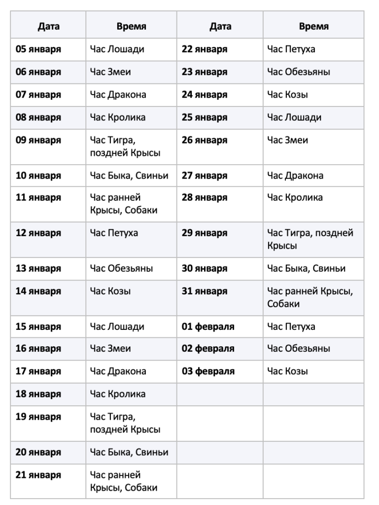| Коза | 08, 20 января, 01 февраля. |