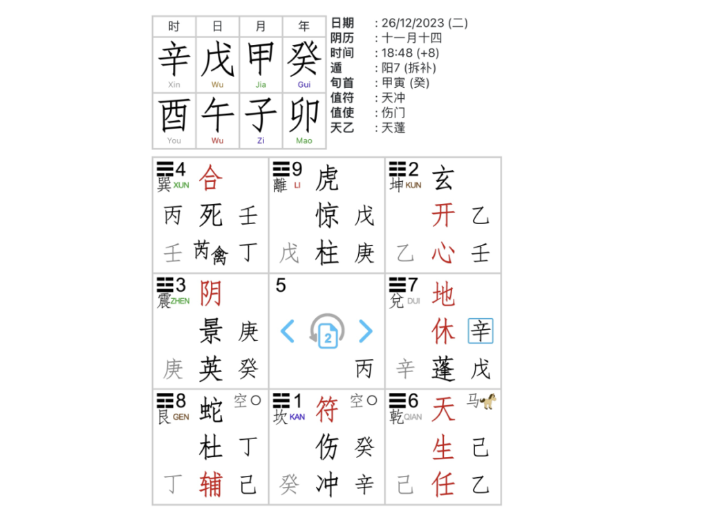 Дата вопроса: 26.12.2023 час Петуха. Судьба по году девушки 辛. Карта расклада цимэнь на момент вопроса: